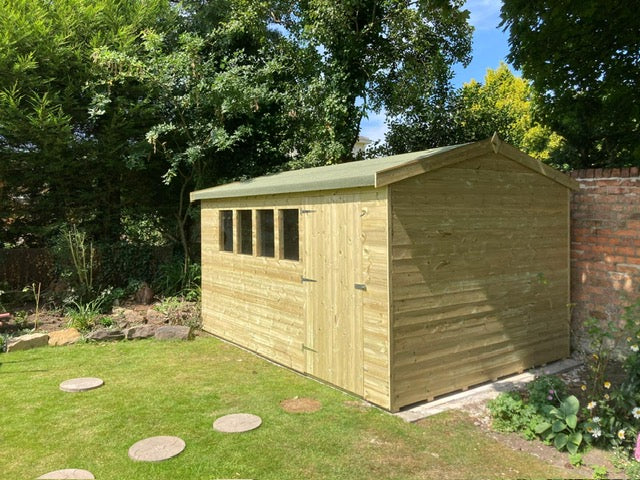 The HiPex Shed from City Sheds combines the sleek modernity of a Pent roof with practicality and charm of a dual-pitch Apex design. This unique hybrid structure offers maximum internal working height while maintaining an unobtrusive and stylish exterior, making it the perfect choice for those seeking both functionality and aesthetic appeal. Crafted with 12mm tongue and groove cladding and supported by a robust 38x50 framework, the HiPex Shed is built to last.